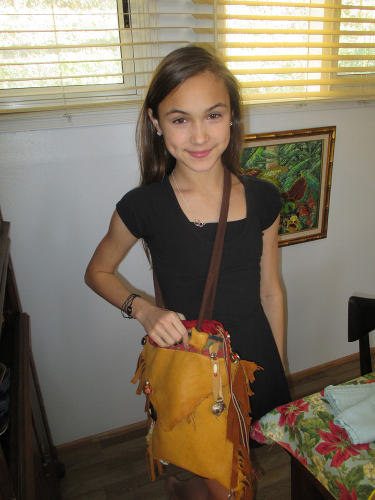 Addy models a smaller version of my Messenger bag Published on March 18, 2014 in GalleryFull resolution (750 × 1000) ← Previous Next → supple soft deerskin side fringed trimmed with antique or reclaimed jewelry Fully lined with pouches inside Shoulder straps braided with leather and suede cloth. Share this:PinterestLinkedIn