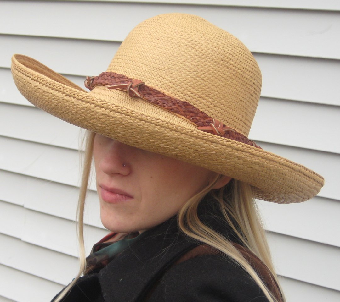 Camel tan panama hat .Rafia band trim August 31, 2014Full resolution (1080 × 961) ← Previous Next → Super large brim for sun shade Natural roll up trim,gently blocked. To keep shape store on a flat surface Share this:PinterestLinkedIn
